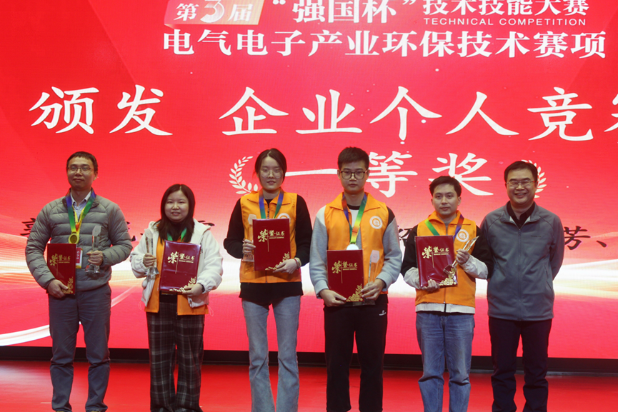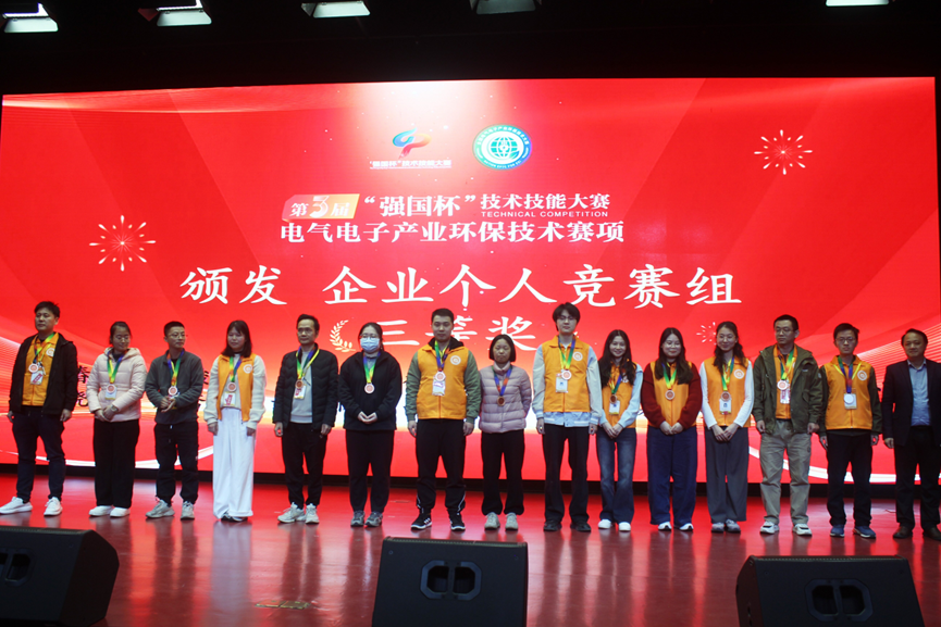2025年1月11日,备受瞩目的第三届“强国杯”技术技能大赛电气电子产业环保技术赛项总决赛圆满落幕。CTI华测检测代表队凭借扎实的理论知识和高超的实操技能,在个人赛中大放异彩,取得了骄人的成绩。其中,4人勇夺一等奖;6人斩获二等奖;5人荣获三等奖,郭小锐以其优异的成绩获得了第一名。作为电子电器企业优秀的合作伙伴,CTI华测检测携手多个企业组队参加了大赛团体赛。比赛中,通过与合作伙伴的紧密协作,均获得了优异的成绩。其中,中兴通讯代表队荣获团体比赛一等奖,北京康普锡威获得三等奖,美的厨卫、美的制冷以及无锡德科立光获得了优胜奖的好成绩。此外,由于在大赛协办中的突出贡献,大赛组委会特别为CTI华测检测3名工作者和2名裁判员授予了“优秀工作者”和“优秀裁判员”称号。