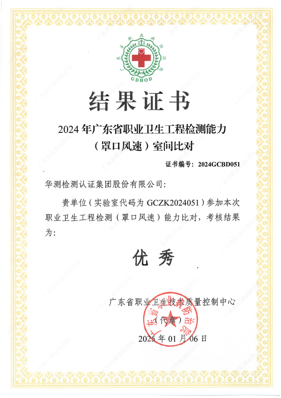 近日,由广东省职业卫生技术质量控制中心联合广东省职业健康工程技术研究中心、广东省防尘毒工程技术中心组织开展的“2024年广东省职业卫生工程检测能力(罩口风速)室间比对”公布最终比对考核结果,华测检测认证集团股份有限公司(简称CTI华测检测)取得“优秀”评定结果。
