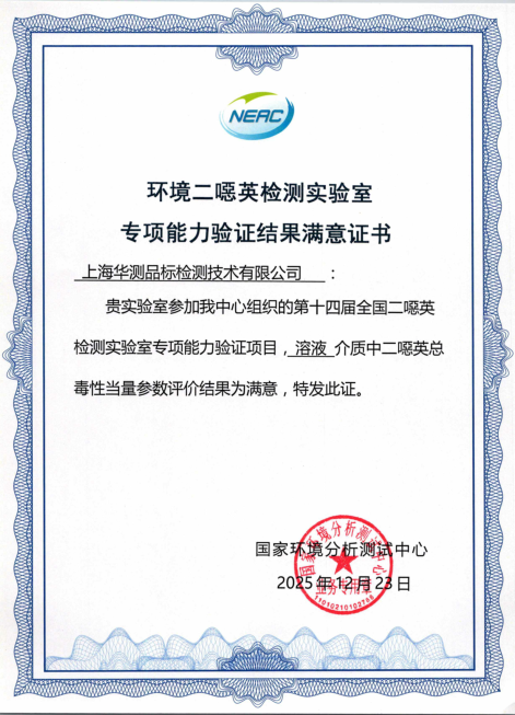 近日,华测检测认证集团股份有限公司(简称CTI华测检测,股票代码300012)上海二噁英实验室,在国家环境分析测试中心组织的第十四届全国二噁英检测实验室专项能力验证项目中,凭借精准的检测技术与严谨的质量把控,溶液介质中二噁英总毒性当量参数评价结果取得“满意”认可,成功荣获环境二噁英检测实验室专项能力验证结果满意证书。