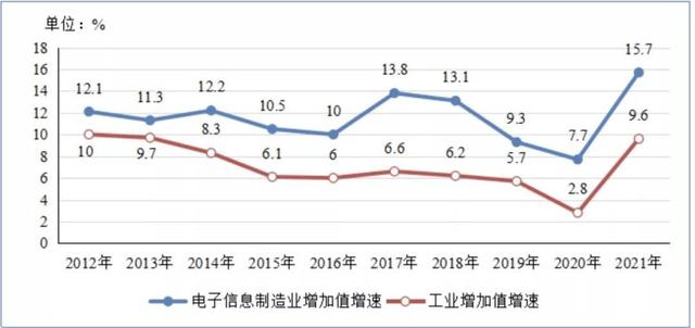 不过,2021年全国规模以上电子信息制造业增加值比上年增长了15.7%,在41个大类行业中,排名第6,增速创下近十年新高,较上年加快8.0个百分点。工信部称,在全球集成电路制造产能持续紧张背景下,近两年我国集成电路相关领域投资活跃,实现半导体器件设备、电子元件及电子专用材料制造投资额的大幅增长,带动电子信息制造业固定资产投资两年平均增长17.3%,远高于制造业两年平均的5.8%。