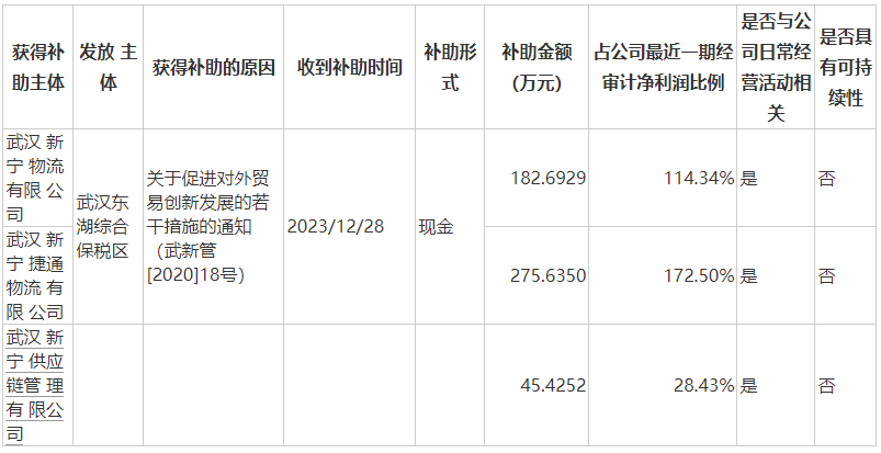 12月28日,新宁物流(300013)发布公告称,公司下属子公司于近日收到了与收益相关的政府补助共计503.75万元,预计对公司2023年利润总额的影响为增加503.75万元。
