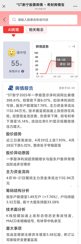希财舆情宝AI监控系统显示,该股近30天舆情热度飙升238%,成为"摘帽概念"中的舆情焦点。