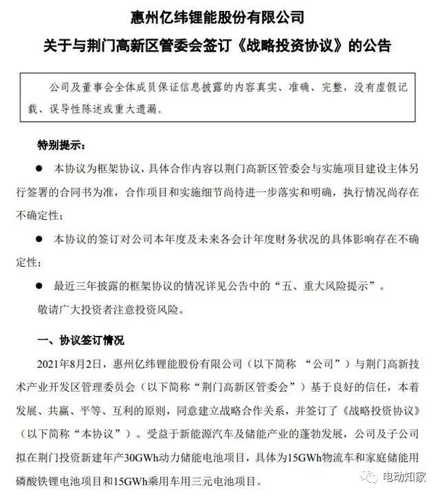 电动知家消息,8月4日,亿纬锂能发布公告称,与荆门高新区管委会建立战略合作关系,并签订了《战略投资协议》。受益于新能源汽车及储能产业的蓬勃发展,公司及子公司拟在荆门投资新建年产30GWh动力储能电池项目,具体为15GWh物流车和家庭储能用磷酸铁锂电池项目和15GWh乘用车用三元电池项目。