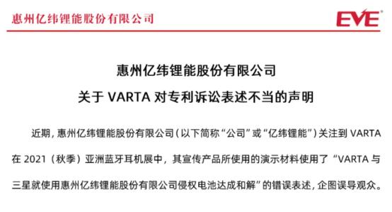 10月22日,亿纬锂能官方突然发布一则声明,称德国瓦尔塔(VARTA)公司代表在宣传其产品所使用的演示材料中使用了“VARTA与三星就使用惠州亿纬锂能股份有限公司侵权电池达成和解”的错误表述,企图误导观众。