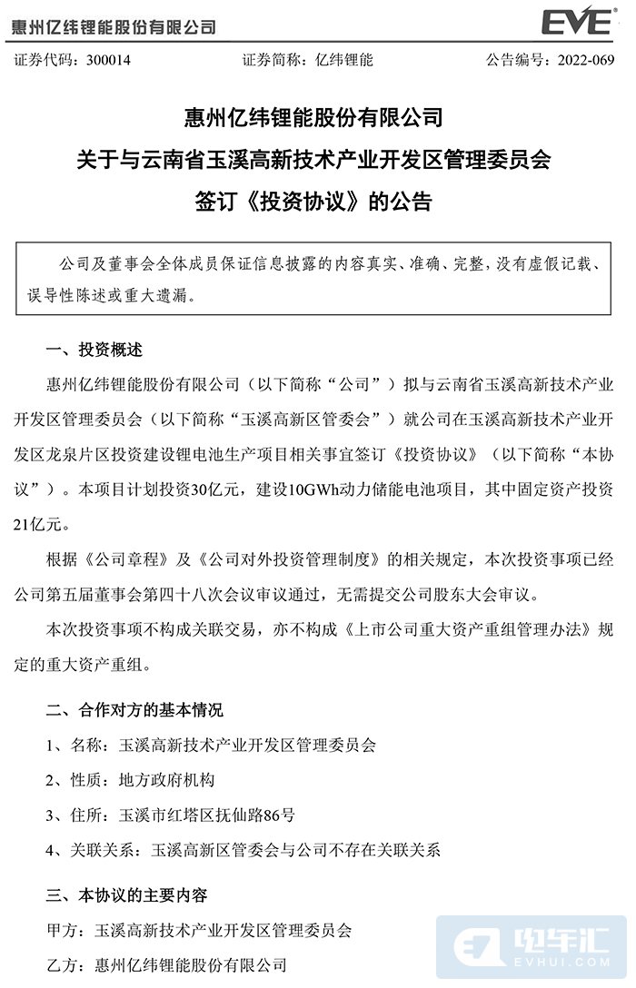 电车汇消息:5月17日,亿纬锂能发布关于与云南省玉溪高新技术产业开发区管理委员会签订《投资协议》的公告。公司计划投资30亿元,建设10GWh动力储能电池项目,其中固定资产投资21亿元。