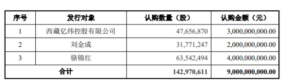 2022年6月7日,公司与西藏亿纬控股有限公司、刘金成、骆锦红签署了《附条件生效的股份认购协议》。本次向特定对象发行股票为锁价发行,发行价格为人民币62.95元/股,最终发行数量为142,970,611股,合计募集资金总额为人民币9,000,000,000.00元,扣除不含税发行费用人民币26,403,745.85元,募集资金净额为人民币8,973,596,254.15元,未超过发行方案中募集资金规模。发行对象以现金认购。本次发行对象最终确定为3家。