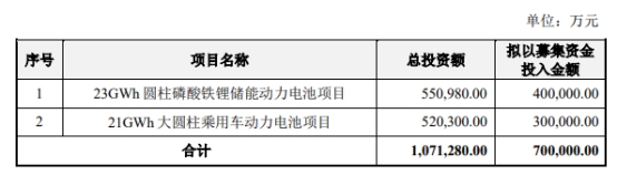 公司本次发行可转债拟募集资金总额不超过700,000.00万元(含700,000.00万元),扣除发行费用后,募集资金净额拟投资于以下项目:23GWh圆柱磷酸铁锂储能动力电池项目、21GWh大圆柱乘用车动力电池项目。