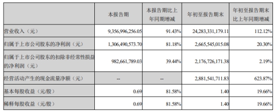 公司三季报显示,今年前三季度,亿纬锂能实现营业收入242.83亿元,同比增长112.12%;归属于上市公司股东的净利润26.66亿元,同比增长20.30%;归属于上市公司股东的扣除非经常性损益的净利润21.77亿元,同比增长2.19%;经营活动产生的现金流量净额28.82亿元,同比增长623.87%。