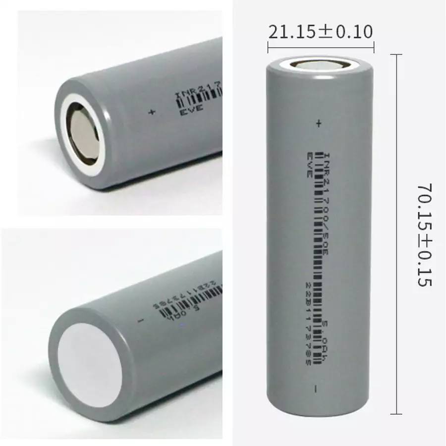 亿纬锂能 50E 21700 锂离子电芯属于圆柱形钢壳电芯,与 14500、18650、26650 等常见的圆柱形钢壳电芯采用相同的命名方式。其中“21”代表其直径 21mm,“700”代表其长度为 700mm,实测直径 21.15±0.1mm,长度 70.15±0.15mm。正极采用四爪顶盖,平底设计,是近年来很常见的一种高容量电芯规格。
