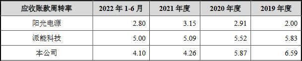 报告期内,沃太能源应收账款周转率分别为6.59次、5.87次、4.26次和4.10次,同行业可比上市公司阳光电源应收账款周转率分别为2.00次、2.91次、3.15次和2.80次,同行业可比上市公司派能科技应收账款周转率分别为5.83次、5.52次、5.09次和5.00次。