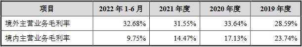 报告期内,沃太能源境外主营业务毛利率分别为28.59%、33.64%、31.55%、32.68%,境内业务毛利率分别为23.74%、17.13%、14.47%、9.75%,境内主营业务毛利率远低于境外而且在逐年下滑。