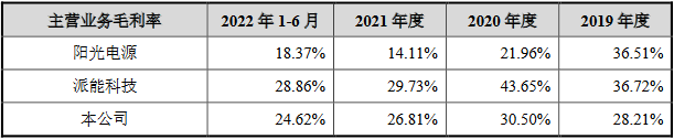同期,同行业可比上市公司中,阳光电源的主营业务毛利率分别为36.51%、21.96%、14.11%和18.37%,派能科技主营业务毛利率分别为36.72%、43.65%、29.73%和28.86%。