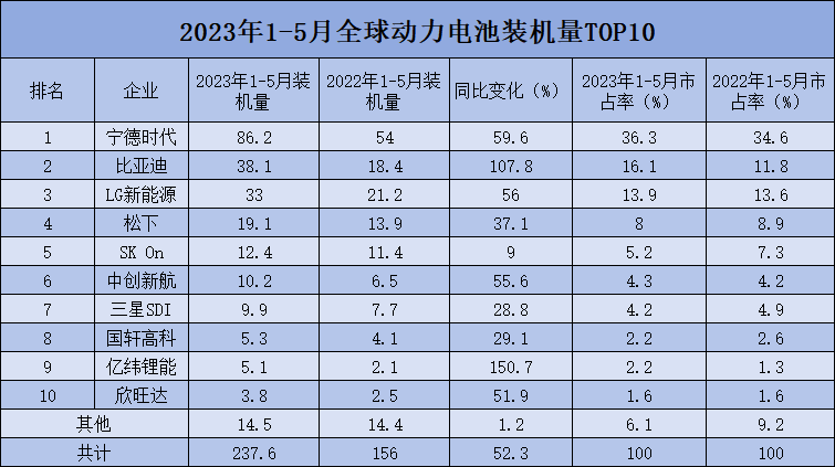 在2023年1-5月全球动力电池装机量前十排名中,宁德时代以86.2GWh的装机量仍稳居全球第一,比亚迪以38.1GWh的装机量保持第二,LG新能源排名第三,排名第四到第十的企业分别是松下、SK On、中创新航、三星SDI、国轩高科、亿纬锂能、欣旺达。