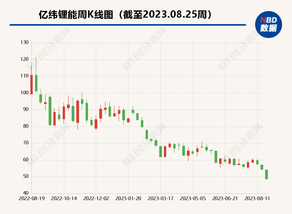 作为动力电池领域的龙头企业,亿纬锂能股价在2021年12月站上每股152.27元的高点,此后便在波动中下滑。今年以来,公司股价一路下行,截至8月25日收盘,每股价格仅为48.6元,年内跌幅达4成以上,市值跌破1000亿元。