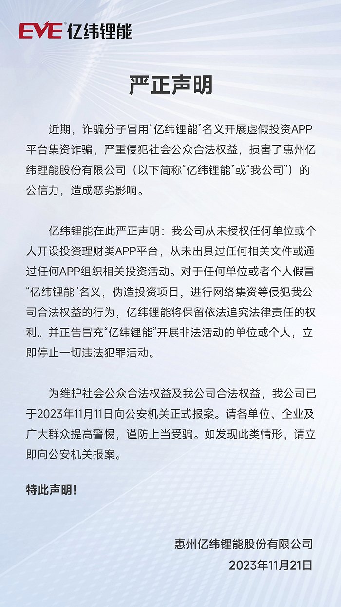 11月21日,亿纬锂能官微发布声明称,近期,诈骗分子冒用“亿纬锂能”名义开展虚假投资APP平台集资诈骗。亿纬锂能表示,公司从未授权任何单位或个人开设投资理财类APP平台,从未出具过任何相关文件或通过任何APP组织相关投资活动。对于任何单位或者个人假冒“亿纬锂能”名义,伪造投资项目,进行网络集资等侵犯公司合法权益的行为,亿纬锂能将保留依法追究法律责任的权利。公司已于2023年11月11日向公安机关正式报案。