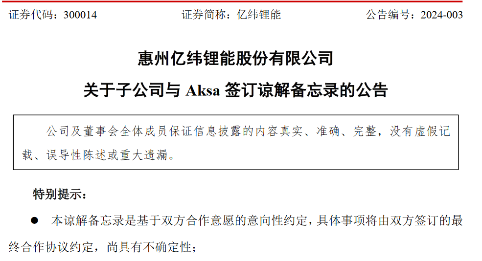 1月15日亿纬锂能发布公告称,惠州亿纬锂能股份有限公司(以下简称“亿纬锂能”)子公司湖北亿纬动力有限公司(以下简称“亿纬动力”)与Aksa Jenerat?r Sanayi A.?(以下简称“Aksa”)于2024年1月12日签署《MEMORANDUM OF UNDERSTANDING》(谅解备忘录)。