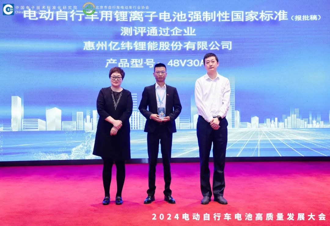 4月24-25日,由中国电子质量管理协会主办的“聚焦安全,共享发展——2024电动自行车电池高质量发展大会”于北京举办。亿纬锂能作为协办单位之一,携麟驹系列电动两轮车电池亮相,并荣获由中国电子技术标准化研究院颁发的首批“电动自行车用锂离子电池强制性国家标准测评通过企业”认证证书。