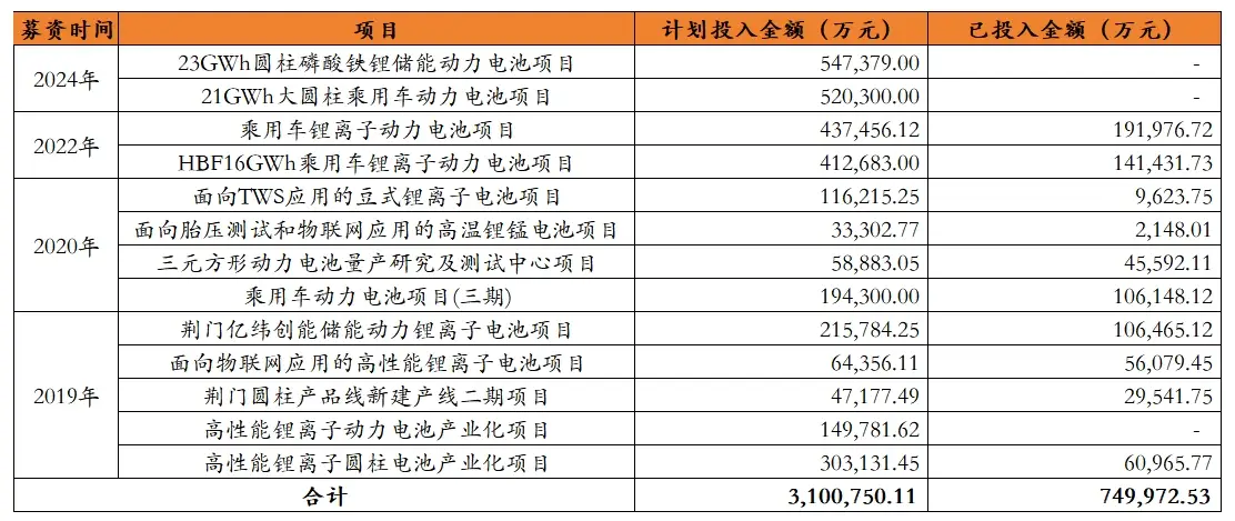 此次,拟扩产的23GWh圆柱磷酸铁锂储能动力电池项目及21GWh大圆柱乘用车动力电池项目,计划总投资106.77亿。据统计,包括此次50亿在内的4次募资,亿纬锂能计划投资金额310.08亿,目前已投入金额仅75亿。