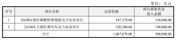 根据募集说明书,亿纬锂能本次拟发行可转债募集资金总额不超过50亿元,分别投向23GWh圆柱磷酸铁锂储能动力电池项目(下称“项目一”)和21GWh大圆柱乘用车动力电池项目(下称“项目二”),募集资金投入金额分别为31亿元、19亿元。