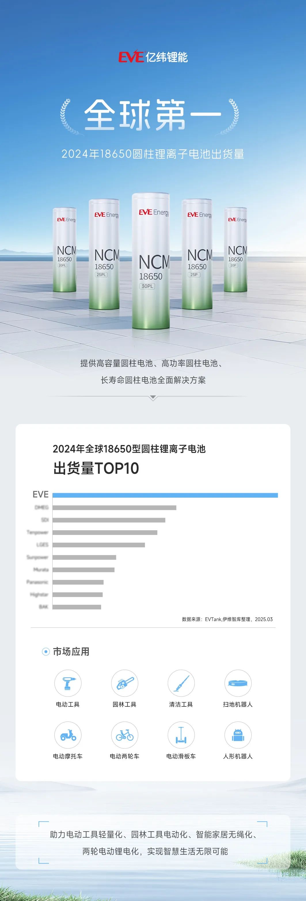 2024年亿纬锂能18650圆柱电池出货量,全球第一!