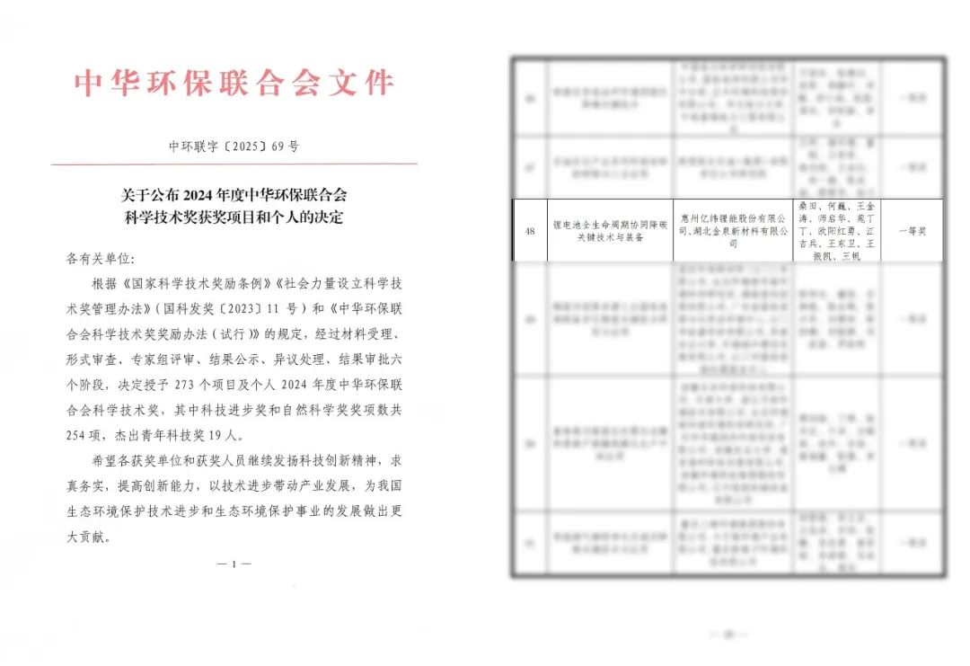 近日,中华环保联合会发布2024年度科学技术奖评审结果,惠州亿纬锂能股份有限公司联合湖北金泉新材料有限公司凭借“锂电池全生命周期协同降碳关键技术与装备”项目,荣获中华环保联合会2024年度科技进步奖一等奖。