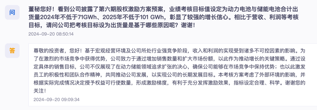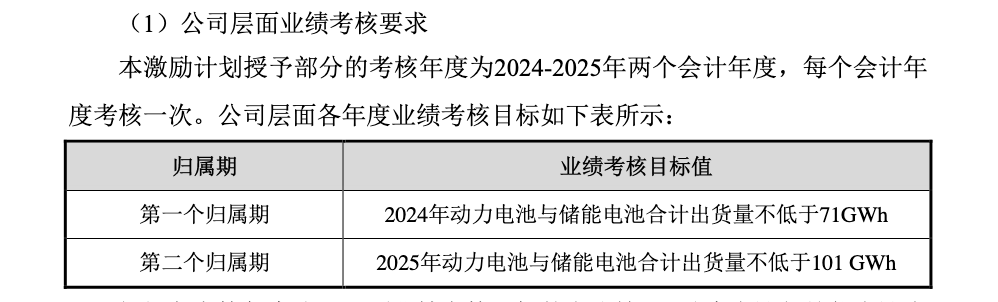 令市场质疑的是,公司层面业绩考核要求并非利润,而是出货量——2024年及2025年动力电池与储能电池合计出货量不低于71GWh和101GWh。