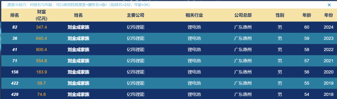 根据2024新财富杂志500创富榜显示,亿纬锂能实控人刘金成家族身家从2023年640.4亿元下降至347.4亿元,排名82位。
