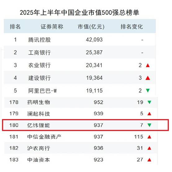 7月22日,2025年《财富》中国500强排行榜正式发布,惠州亿纬锂能股份有限公司(简称:亿纬锂能,股票代码:300014)以营业收入67.57亿美元位列第317位。同时,在Wind发布的2025年上半年“中国上市企业市值500强”榜单中,亿纬锂能以市值937亿元排名第180位。一系列成绩,充分体现了亿纬锂能作为锂电池领域领军企业,以创新技术抓住新能源产业风口,实现稳步发展的卓越表现。