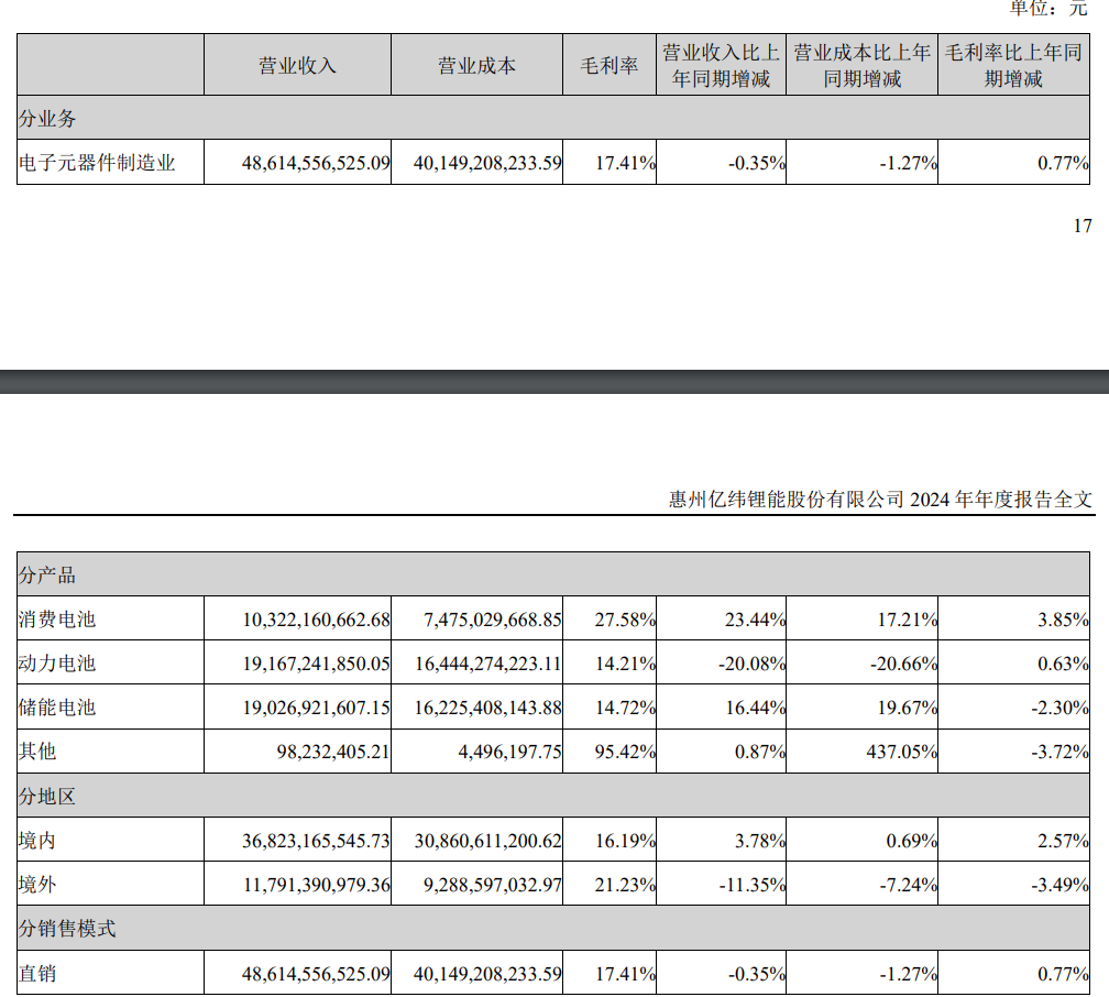 事实上,在此之前,亿纬锂能的产能利用率已经在逐年下滑。据可转债招股书和募集赴港招股说明书,2021年、2022年和2023年,公司动力储能锂离子电池产能利用率分别为96.14%、92.82%和 72.9%,至2024年底,其动力储能电池产能利用率更是下降至69.2%,创下近四年新低。