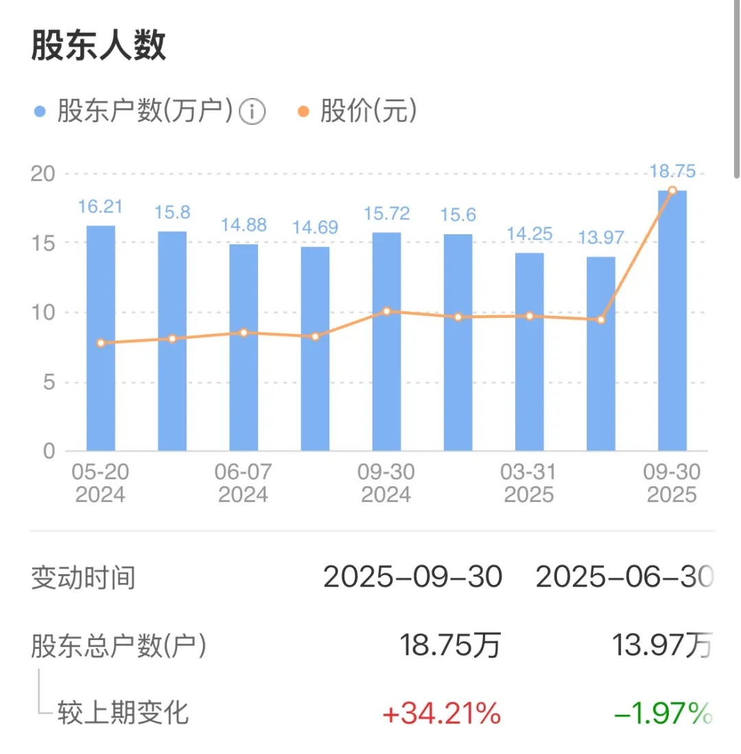 与此同时,公布的股东数却从6月的13.97万户增加到9月的18.75万户,有近5万户的增长,果然都是买涨不买跌啊,增长幅度高达34.21%。