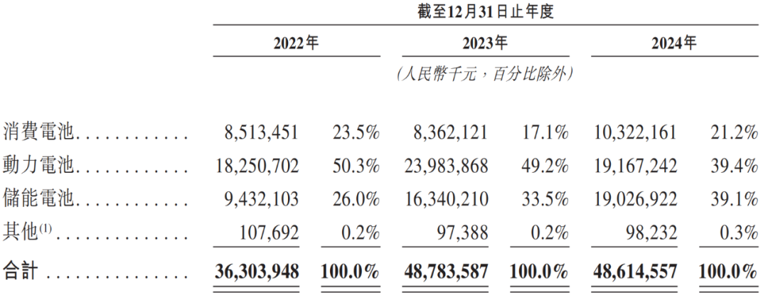根据招股书,2022年至2024年,储能电池业务收入分别为94.32亿元、163,40亿元和190.27亿元,占总营收的比例分别为26.0%、33.5%和39.1%,呈现出快速增长态势,无论收入还是占比,均几乎与动力电池业务持平。