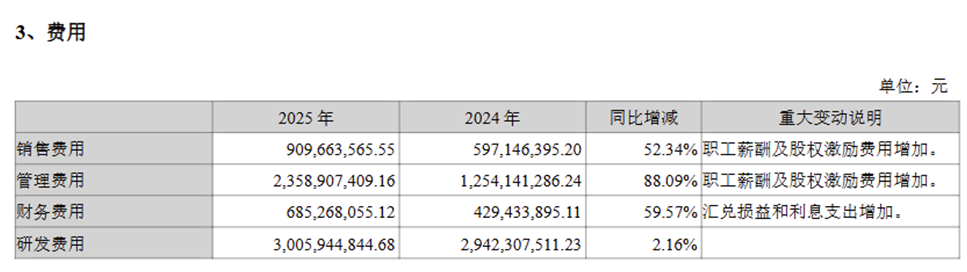 费用端压力进一步加剧盈利困境。2025年公司持续加大研发与市场投入,叠加股权激励费用摊销,期间费用率居高不下,直接侵蚀本已薄弱的利润空间。营收高速增长与利润停滞不前形成鲜明反差,凸显公司“以价换量”的粗放增长模式已走到尽头,在行业同质化竞争中缺乏定价权与技术溢价,只能通过牺牲利润换取市场份额,长期盈利能力堪忧。