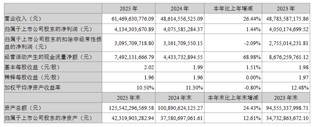 年报数据显示,公司全年实现营业收入614.70亿元,同比增长26.44%,规模持续扩张;但归母净利润仅41.34亿元,同比微增1.44%,增速远低于营收增速,盈利增长近乎停滞。