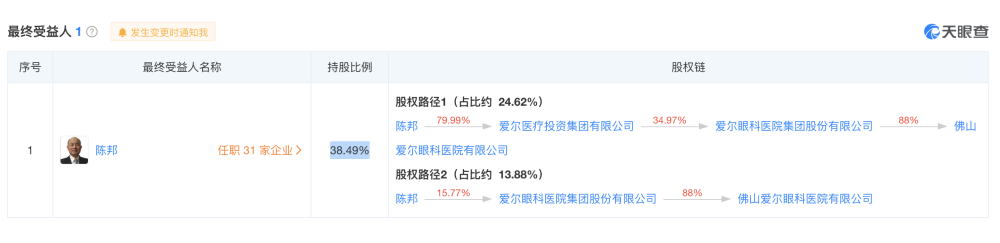佛山爱尔眼科医院有限公司,成立于2014年,爱尔医疗投资集团成员,实缴资本2400万人民币,法人代表何伟亮,爱尔眼科医院集团股份有限公司为大股东,持股比例88%,最终受益人陈邦,持股比例38.49%。
