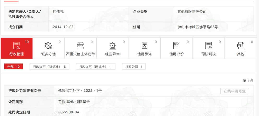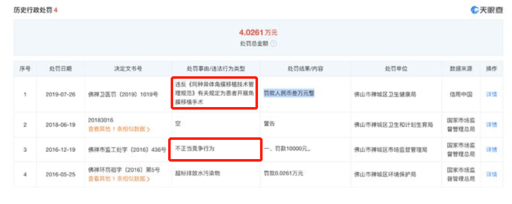 企业存在历史行政处罚4项,2019年曾因违反《同种异体角膜移植技术管理规范》有关规定为患者开展角膜移植手术,被佛山市禅城区卫生健康局罚款3万元。