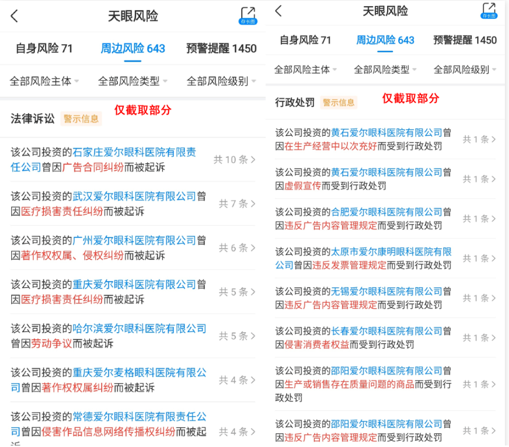 另据信息显示,全国曾有多家爱尔眼科医院因医疗损害责任纠纷被起诉,还有因虚假宣传、违反广告内容管理规定、在生产经营中以次充好等被行政处罚。