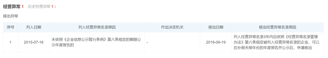 2015年7月16日,因未依照《企业信息公示暂行条例》第八条规定的期限公示年度报告,曾被列入经营异常名录。