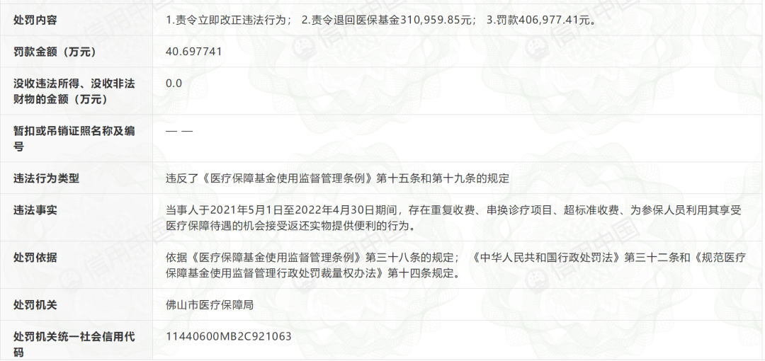信用中国信息显示,近日,佛山爱尔眼科因2021年5月1日至2022年4月30日期间,存在重复收费、串换诊疗项目、超标准收费、为参保人员利用其享受医疗保障待遇的机会接受返还实物提供便利的行为,被责令退回医保基金31万元,罚款40.7万元,累计罚没71.7万元。