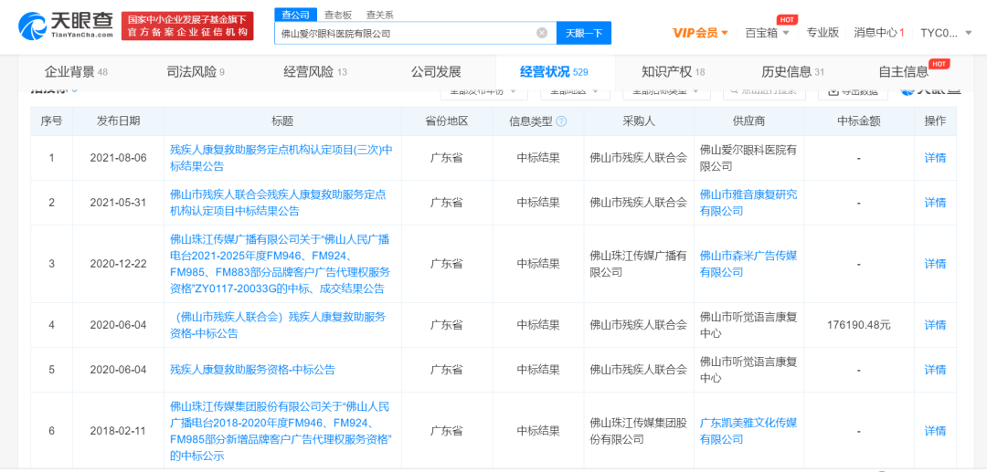 佛山爱尔眼科是国内规模最大的民营眼科医疗机构爱尔眼科在佛山禅城区的一家专科医院,资料显示,企业曾多次在广东省中标,包括残疾人康复救助服务资格、残疾人康复救助服务定点机构认定项目等。2018年,医院还获授禅城区“十三五”医学重点专科。