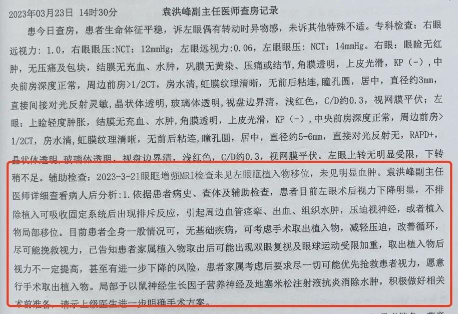 另据4月23日的《病程记录》:“依据患者病史、查体及辅助检查,患者目前左眼术后视力下降明显,不排除植入可吸收固定系统后出现排斥反应,引起周边血管痉挛、出血、组织水肿,压迫视神经,或者植入物局部位移。”