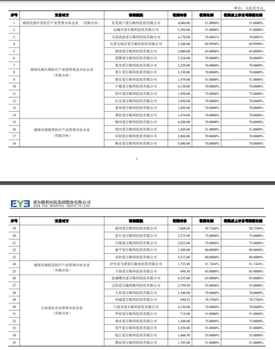 爱尔眼科发布公告显示,公司拟通过自有资金支付方式,以合计8.98亿元的价格,收购虎门爱尔、运城爱尔等35家医院的部分股权。