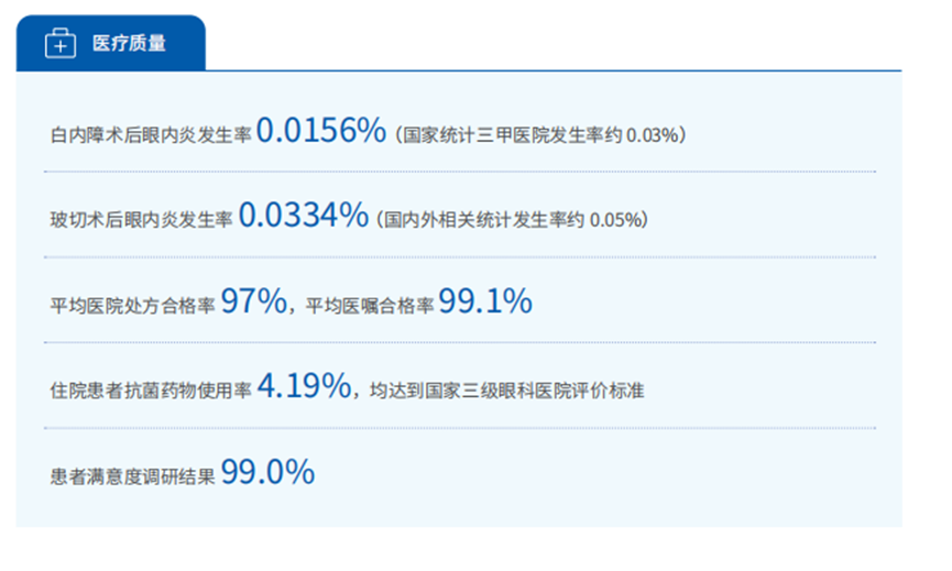 医疗质量管控成效显著,白内障、玻切手术的术后眼内炎发生率、处方合格率、医嘱合格率均超国家三级医院标准。