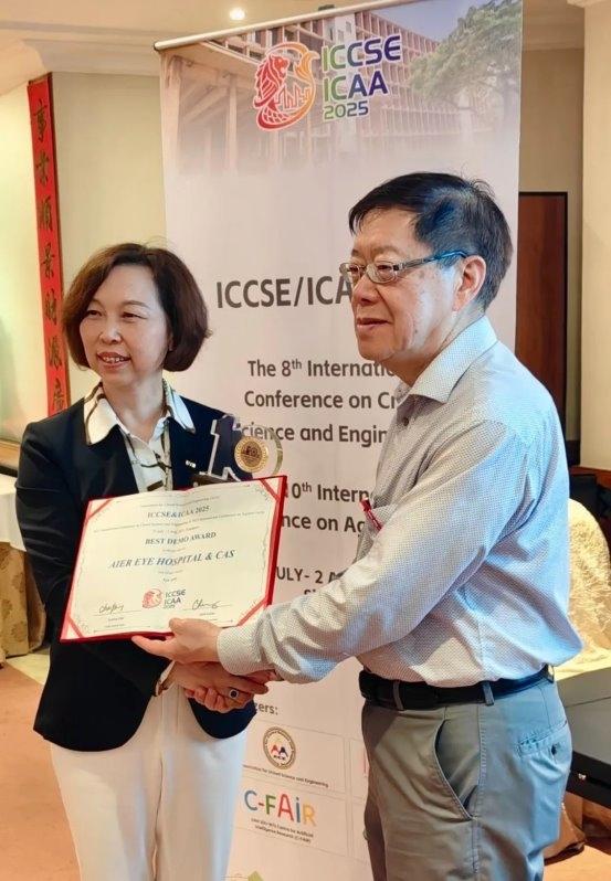 2025 年 7 月 27 日至 8 月 2 日,第八届众智科学与工程国际会议(ICCSE 2025)联合第十届人工智能与乐龄科技国际会议(ICAA 2025)在新加坡盛大举办。会上,由爱尔眼科与中国科学院计算技术研究所联合研发的“AierGPT 及爱尔数字人”从众多项目中脱颖而出,荣获“最佳演示奖(Best Demo Award)”,这一奖项由众智科学与工程国际联盟(ACE)首任理事会主席、加拿大工程院院士 Cyril Leung 教授亲自颁发,彰显了该成果在国际 AI 医疗领域的领先地位。