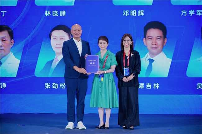 爱尔眼科医院集团董事长陈邦(左一)、爱尔眼科医院集团副总裁王丽华(右一)为老视管理MDT学组组长张丰菊教授(中间)颁发聘书