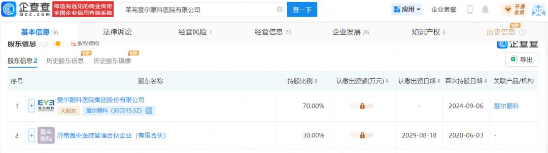莱芜爱尔眼科医院有限公司的大股东为爱尔眼科医院集团股份有限公司,持股比例为70%。