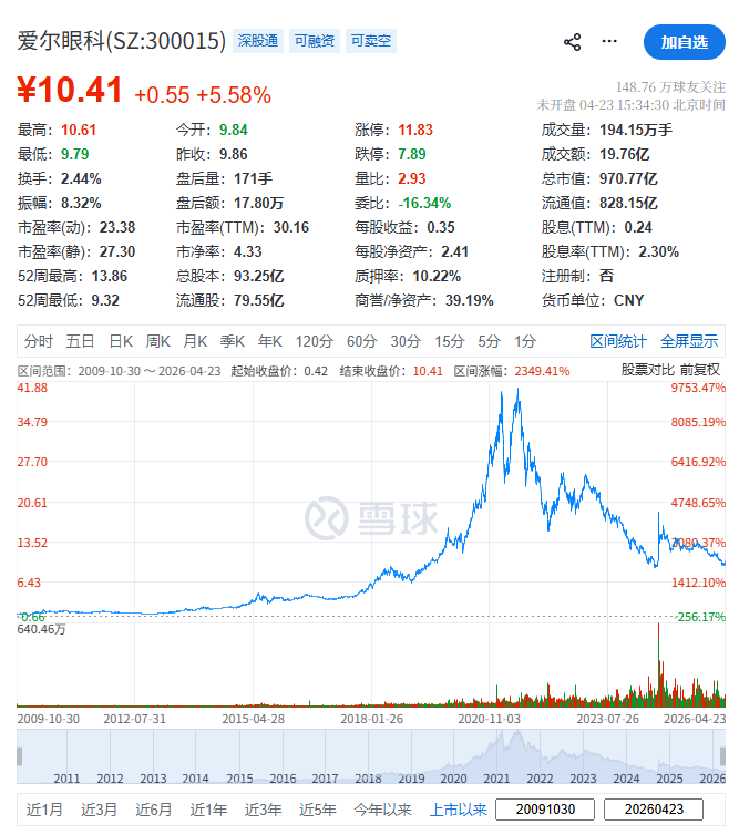 爱尔眼科,于2009年10月30日在深交所上市,截至周四(4月23日)收市,其总市值约人民币970.77亿元。