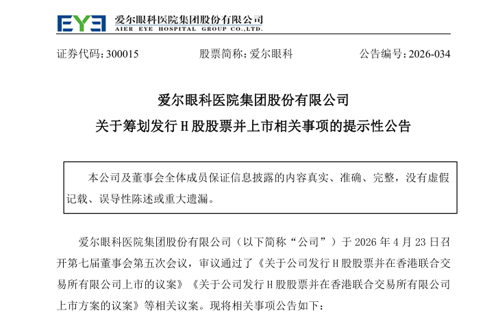 来自湖南长沙的民营医疗服务机构爱尔眼科(300015.SZ)于周四(4月23日)发布公告,董事会会议审议通过了《关于公司发行H股股票并在香港联合交易所有限公司上市的议案》《关于公司发行H股股票并在香港联合交易所有限公司上市方案的议案》等相关议案。现将相关事项公告如下:为深入推进全球化战略,打造国际化平台,实现实业布局与资本结构的联动发展,经公司充分研究论证,公司拟发行境外上市外资股(H股)股票并在香港联合交易所有限公司主板挂牌上市。公司将充分考虑现有股东的利益和境内外资本市场的情况,在股东会决议有效期内(即经公司股东会审议通过之日起24个月或同意延长的其他期限)选择适当的时机和发行窗口完成本次发行并上市。