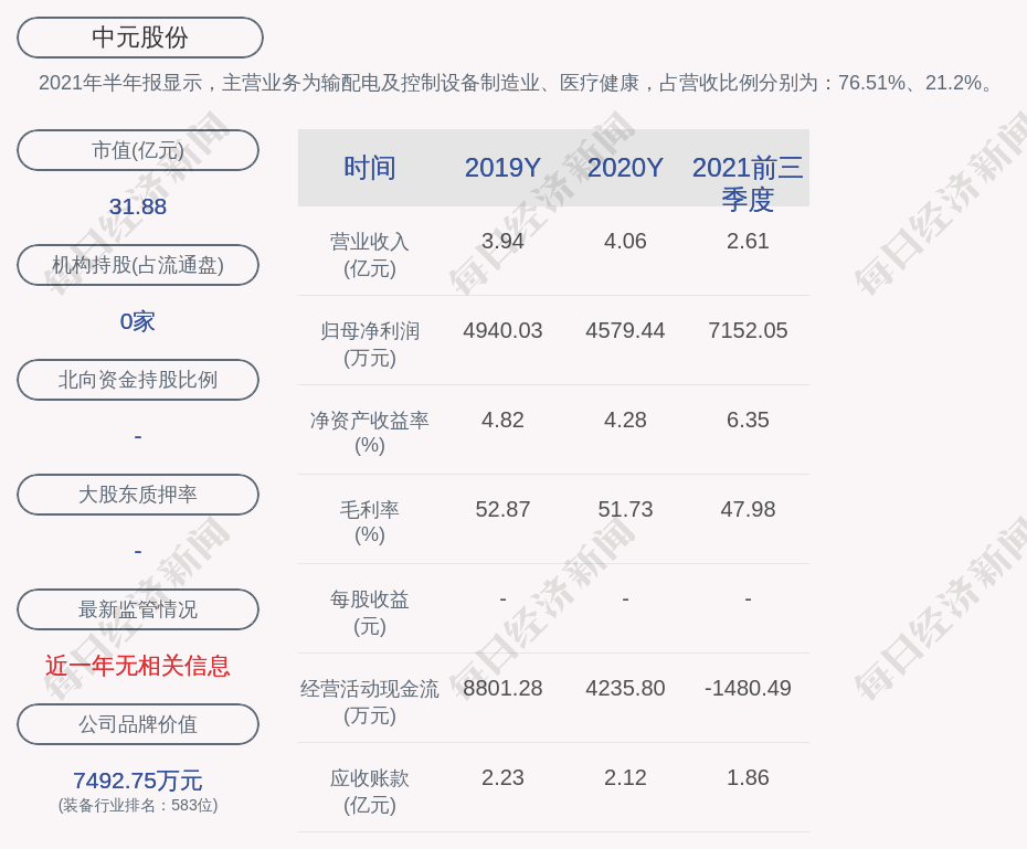 2021年半年报显示,中元股份的主营业务为输配电及控制设备制造业、医疗健康,占营收比例分别为:76.51%、21.2%。