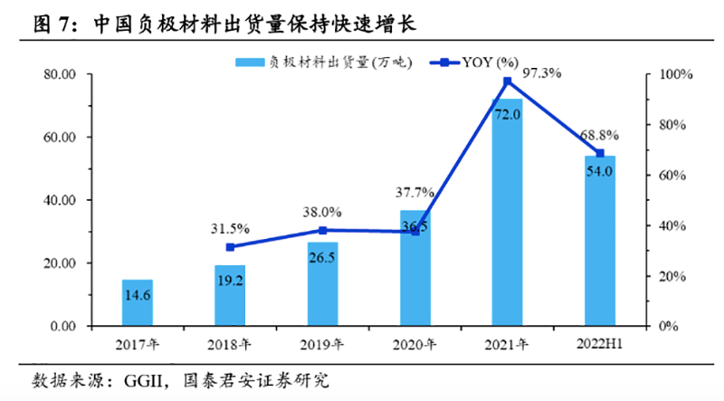 近年来,我国负极材料出货量保持快速提升,中国市占率领衔全球。根据GGII数据,2017至2021年中国负极材料出货量CAGR达49.0%;2021年我国负极材料出货量达到72.0万吨,同比增长97.3%,占全球总出货量的比例由2020年的77%提高到2021年的86%。2022年上半年,我国锂电负极材料出货量54.0万吨,同比增长68.8%。