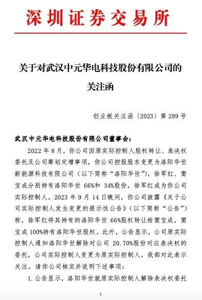 深交所关注函称,2022年8月,中元股份因原实际控制人股权转让、表决权委托及公司筹划定增事项,中元股份控股股东变更为洛阳华世新能源科技有限公司(以下简称“洛阳华世”),徐军红、窦宝成分别持有洛阳华世66%和34%股份,徐军红成为中元股份实际控制人。
